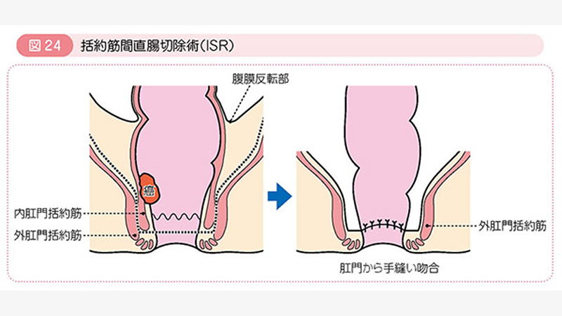 直腸がんが肛門付近に発生することもあります。そのような場合は肛門ごと切除し、人工肛門を作る必要が出てきます。おおよそ肛門から指で届く程度の部分にできた進行がんには直腸切断術が必要となってきます。近年、肛門近くの病変でも肛門を極力温存するようになってきました。その手術方法として括約筋間直腸切除術(intersphincteric resection:ISR)があります。肛門には内肛門括約筋と外肛門括約筋の二つがあり、外肛門括約筋を残すことで肛門機能を保つ方法です。肛門機能の低下はありますが、日常生活は可能な状態に戻ることがほとんどです。ロボット支援手術は、腹腔鏡手術より肛門温存率が明らかに高いデータもあります。当院では適応を的確に判断し、極力肛門を温存するようにしております。