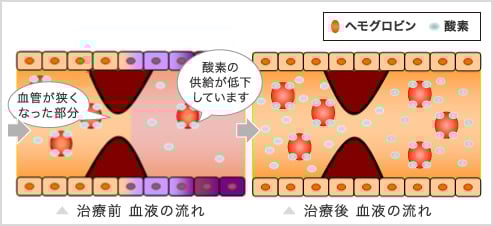 血管の狭窄や閉塞など何らかの原因で酸素不足に陥っている末梢血管障害に対して、高濃度の酸素を体内に取り込むことで通常の呼吸で得られる酸素の量を10倍~20倍まで増加させることができます。これにより低酸素状態に陥った細胞に酸素が供給でき病態が改善していきます。