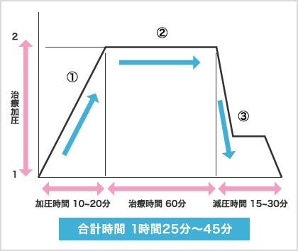 ・治療圧に到達したら気圧がHOLDされますので、テレビ鑑賞・音楽鑑賞が可能です、眠っても結構です(60分)