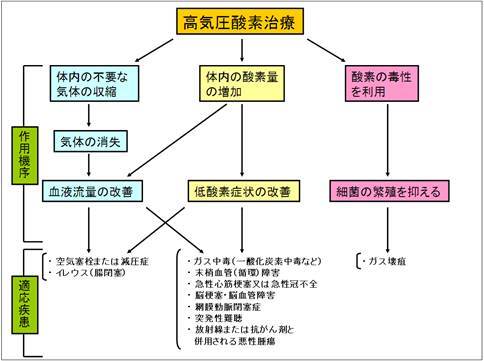 血管内に気泡が生じることで血液の流れが悪くなる空気塞栓症や減圧症、腸管内に貯まったガスが腸管の組織を圧迫することで血液の流れが悪くなる腸閉塞に対して、2気圧という気圧環境を作り出すことで、体内に発生している気泡やガスなどの気体を消失させます。これにより、血液の流れが改善し病態が改善していきます。