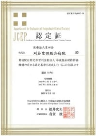当院は、1993年4月に厚生労働省より臨床研修病院指定を受け、医学教育の一環として研修医の育成に努めております。また、2011年2月1日にはNPO法人卒後臨床研修評価機構(JCEP)による初回の認定を受けました。