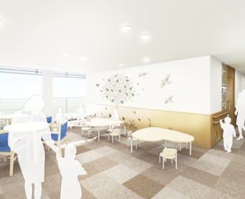 ラウンジは、楽しく過ごせるように、かわいい壁紙を使用して明るい雰囲気を大切にしています。また机や椅子もお子さんが使用しやすいキッズ用をご用意します。