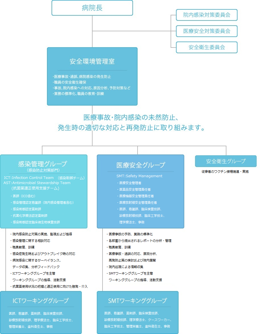 医療安全グループはSMTとSMTワーキンググループと一緒に、病院全体の医療安全に取り組んでいます。