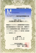 2007年に日本乳がん検診精度管理中央機構が定める「マンモグラフィー検診施設画像認定」を取得しており、マンモグラフィー装置・画像・被ばく線量ともに基準を満たしていることが認められています。さらに精度の高い検査を行うために、「検診マンモグラフィー撮影診療放射線技師認定」取得者を中心とした女性技師が行っていますので、安心して受診していただけます。