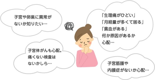 通常の子宮頸がん検診は、細胞を取り調べる検査であり、子宮や卵巣の状態を画像でとらえていません。子宮や卵巣に関するお悩みがあり画像診断をご希望される方は、経腟超音波検査をおすすめします。