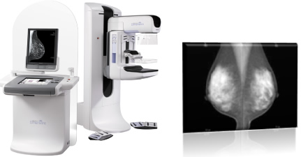 当センターでは2004年よりデジタルマンモグラフィー装置が導入されています。フィルムを使用せず、撮影直後にモニター上に画像を映し出すことができ、短時間で高画質の画像を得ることが可能です。乳腺内の腫瘤や石灰化の有無を調べるため、乳房を押さえ、薄く伸ばした状態で撮影を行います。多少の痛みを伴う検査ですが、乳房を圧迫することによってより情報量が増え、被ばく量も低減できます。