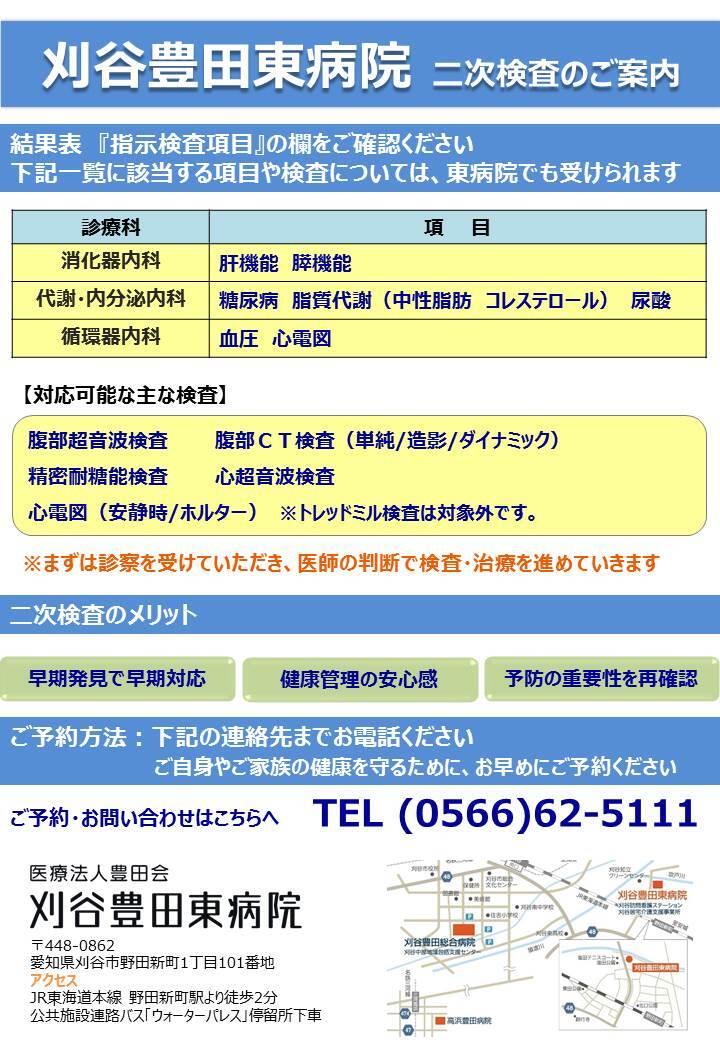一次健診を受診されて二次検診の指示が出た方に対して、結果送付時に【二次検診受診のご案内】を同封しています。