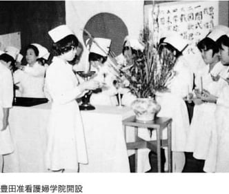 刈谷豊田病院が開院して1カ月後の昭和38年4月、医療法人豊田会によって豊田准看護婦学院が開設された。学院長は古居亮治郎、1日に開校式、5日に入学式が行われ、初年度生22人が入学した。入学資格は中学校卒業以上、修業年限は2年であった。また、校舎は旧2棟地下1階の洗濯室西側にあった。