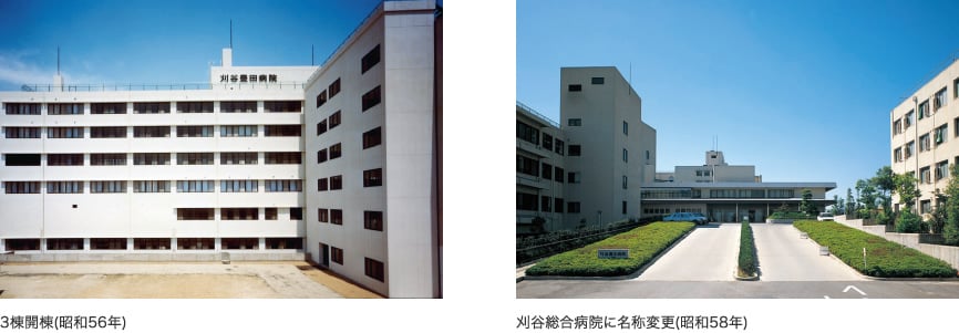 昭和44年4月に東病棟(旧1棟)を開棟し、一般病床数は320床になった。以降昭和46年に東病棟(旧1棟)を増床し人工腎透析室が移設され375床に、昭和55年にも東病棟(旧1棟)を増床し436床、昭和56年にはCCU、CT、血管造影撮影室など最新の設備を誇る3棟が開棟され518床に、昭和58年には伝染病床30床を増やし、病床数561床の規模となった。昭和55年には広域第二次救急病院に指定されている。こうした増床に伴い医療スタッフも充実がはかられた。昭和58年1月には刈谷総合病院と名称を変更、名実ともに地域医療の中心として機能することになった。