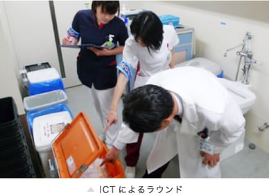 ○医療事故防止や感染予防に関わるチームで定期的に現場のラウンドを行い、OJTによる指導を実施しています。