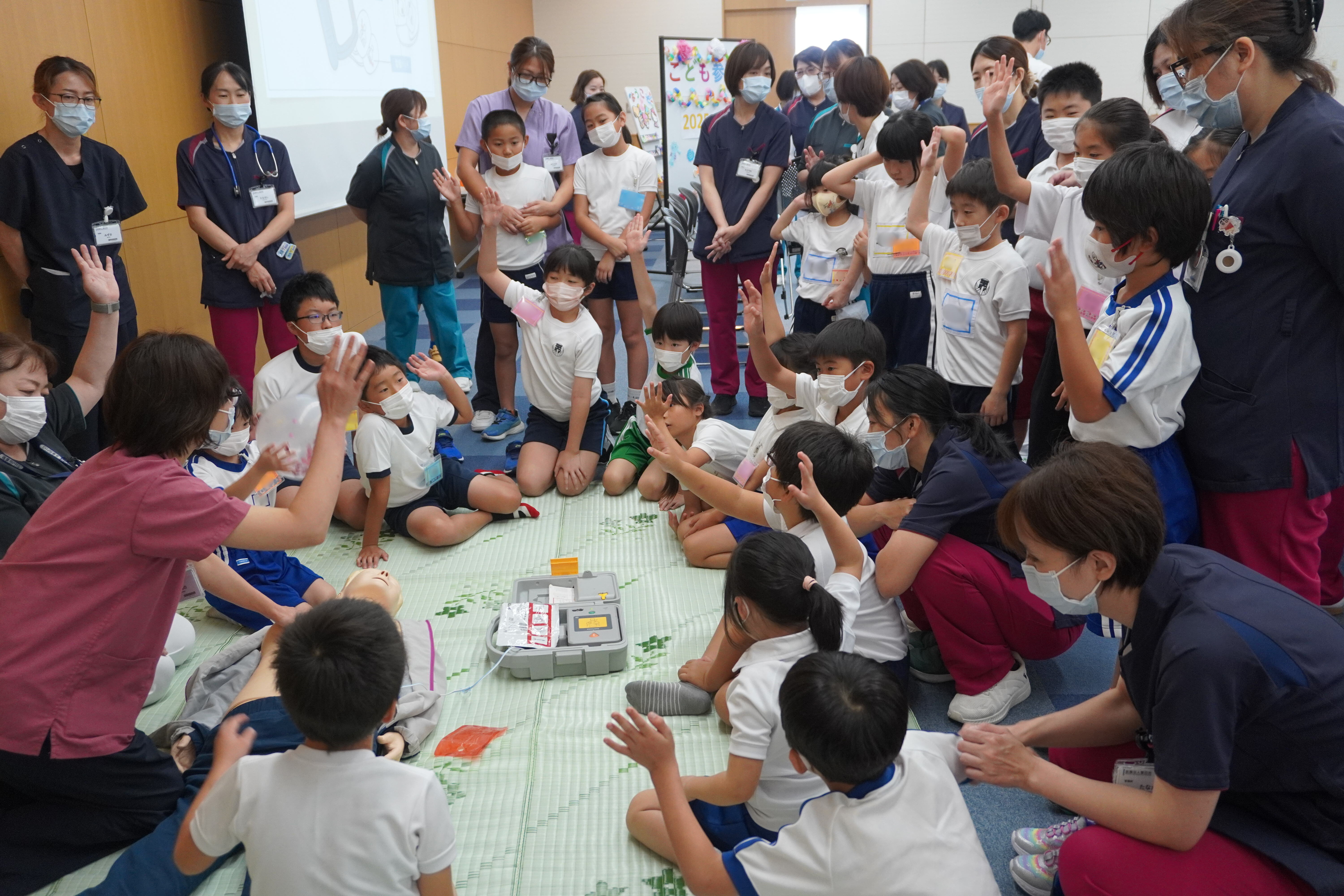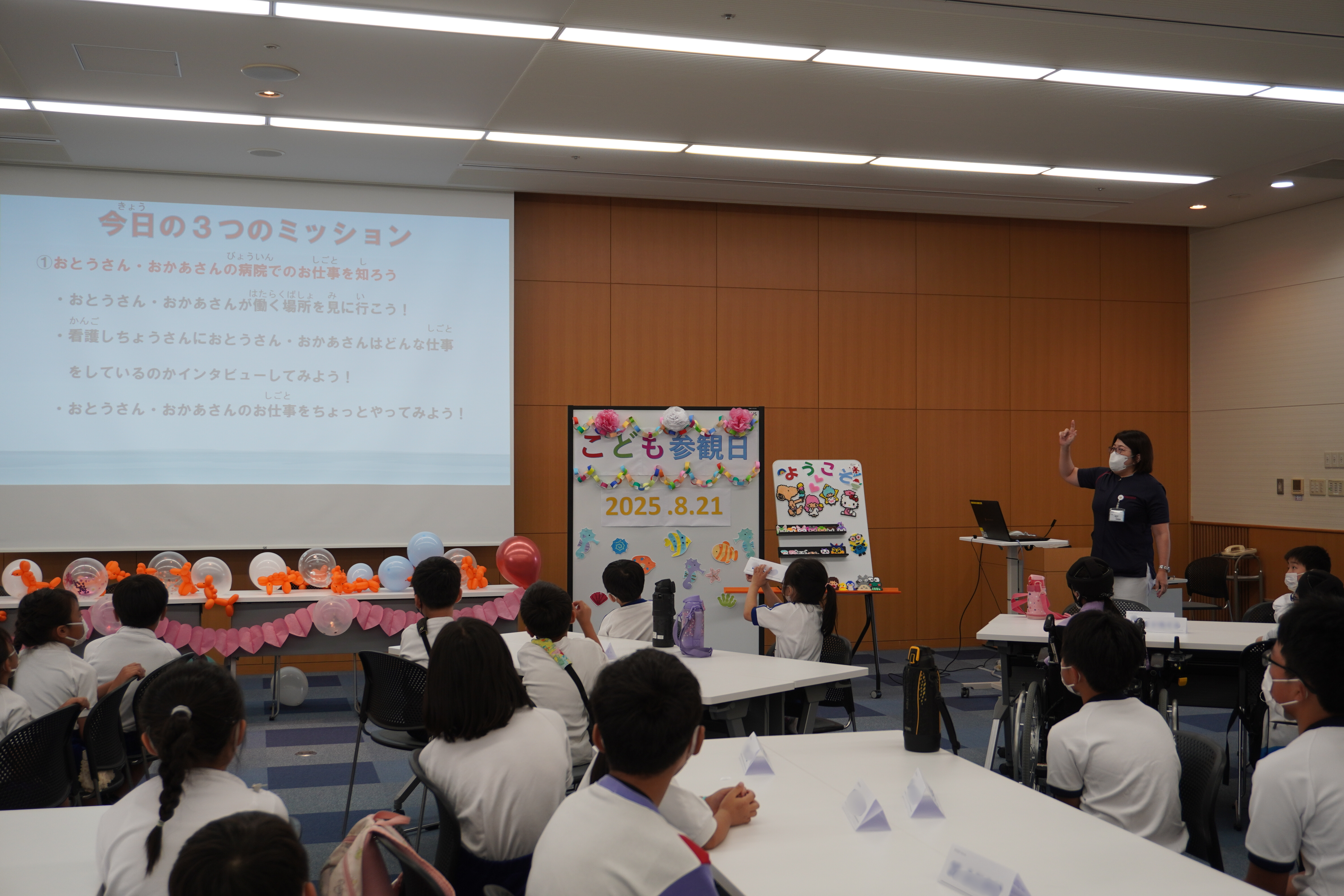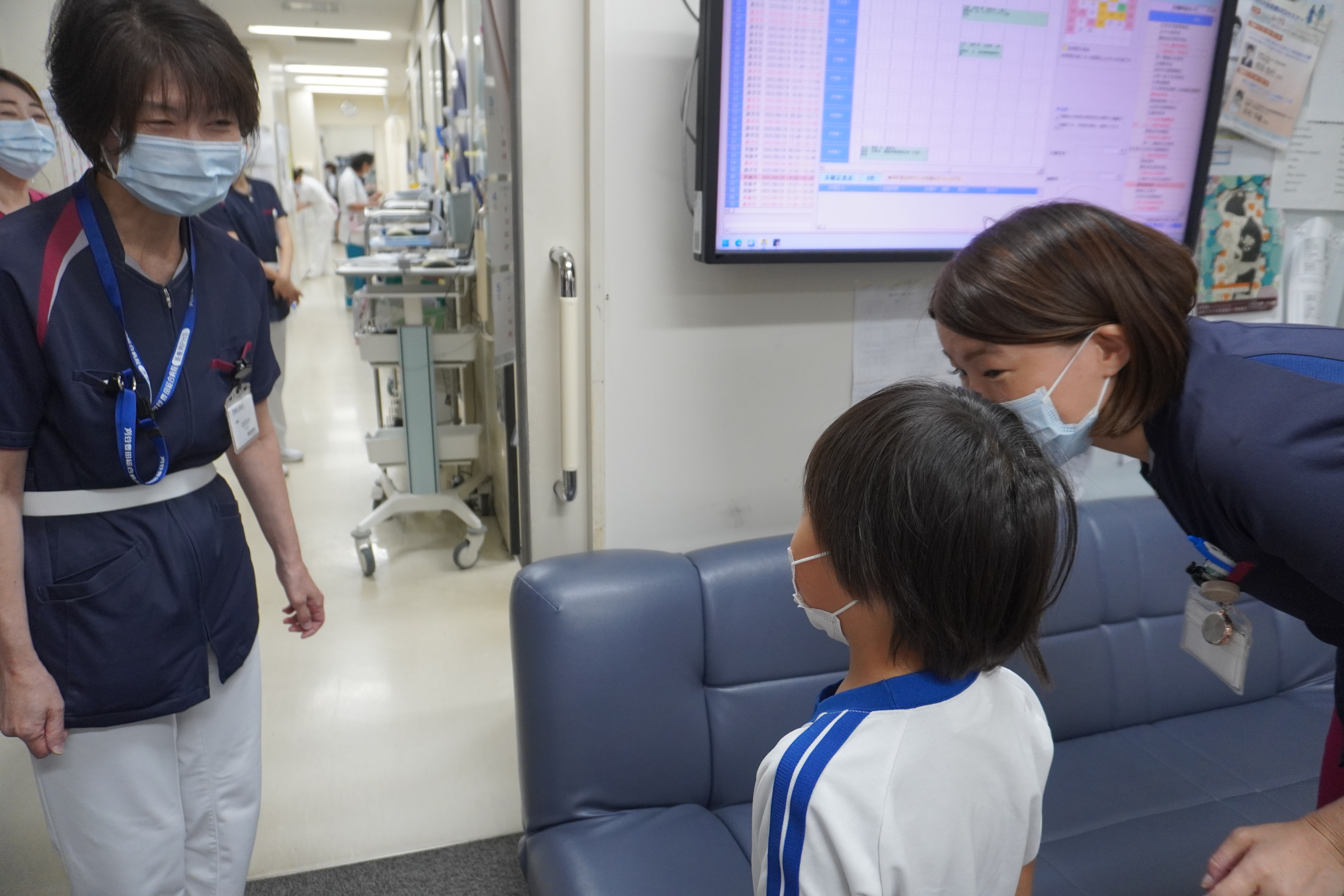 「こども参観日」は、学校で行われる授業参観とは逆で、夏休み中の子どもたちが、お父さん・お母さんの職場を見学する取り組みです。8月21日(木)、看護職員のお子さん37名が参加され、お父さん・お母さんが働く姿を見たり、病院内を探検したりしました。