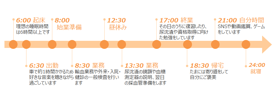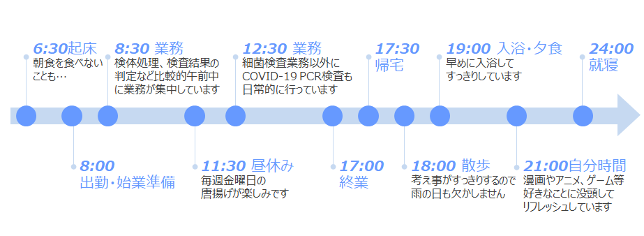 感染制御グループに所属し、培養・同定検査などに加え、午前中は採血業務も行います。
