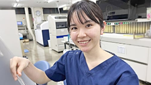 私が配属された輸血グループは、主に輸血検査・一般検査・採血室管理業務を行っています。4ヶ月の研修期間でこれらを学び、8月からはほとんどの業務を1人で任されるようになりました。1人で仕事を行うことへの責任感に戸惑いと不安もありましたが、先輩方はとても優しく、些細な質問にも丁寧に答えてくださいます。相談しやすい環境を作ってくださるので不安も解消されました。休憩時や業務後には他愛のない話で盛り上がることもあります。毎日が慌ただしく、大変だと感じることもありますが、先輩方のおかげで日々頑張れています。