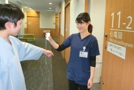 検査前準備や各種検体採取、静脈路確保、電解質液のルート作成、POCT(血液ガス、血糖)、心電図検査、心エコー補助業務などを行っています。