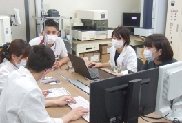 輸血検査・一般検査・採血業務・糖尿病療養指導などを行っています。患者さんと接する機会が多く、ホスピタリティーが求められるグループです。